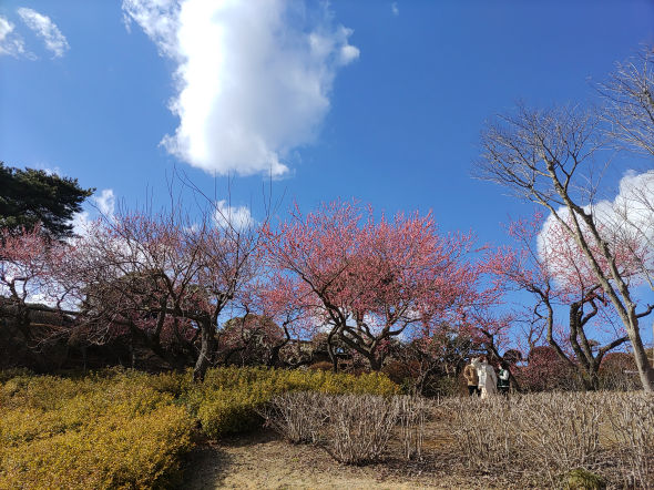 良い天気。でも風強く、梅もまだ3分咲き